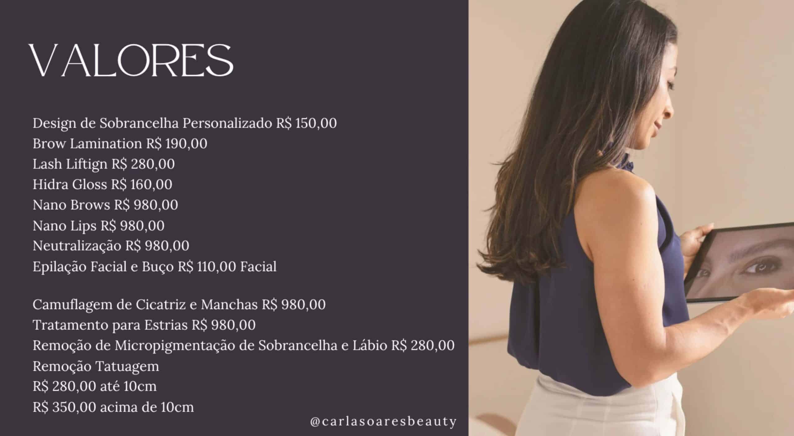 Ofereço serviços de beleza personalizados, executados com técnica, profissionalismo e atenção aos detalhes, sempre respeitando as necessidades individuais de cada cliente. Aqui você encontra a tabela de serviços e valores.![]()
